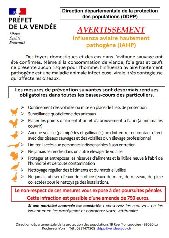👉 À tous les détenteurs de volailles, merci de bien vouloir veiller à prendre toutes les précautions et dispositions nécessaires afin de limiter la diffusion du virus