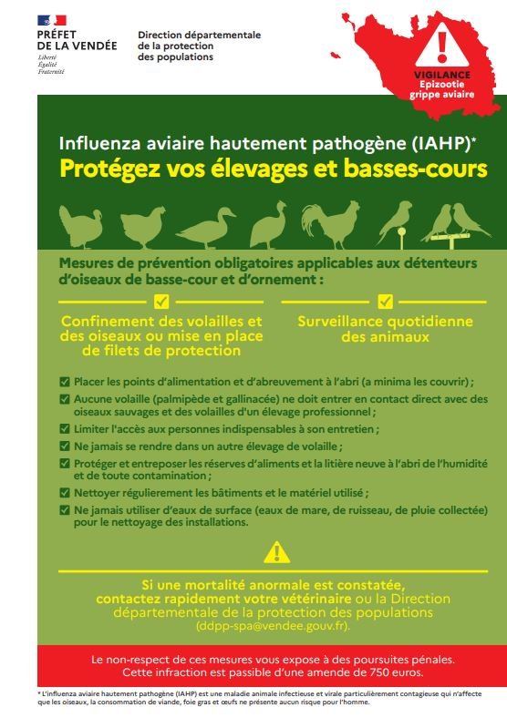 La Préfecture de la Vendée informe qu’en raison de la présence du virus de l’influenza aviaire hautement pathogène (IAHP), la vigilance est renforcée sur le territoire.