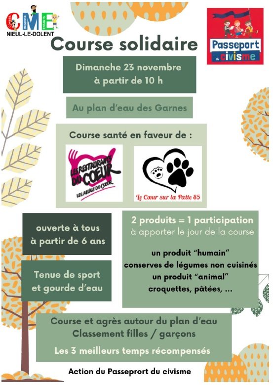 Dans le cadre du Passeport du civisme, le Conseil Municipal des Enfants organise une course solidaire en faveur des Restos du Cœur et de l'association "Le cœur sur la Patte 85" dimanche 23 novembre à partir de 10h au plan d'eau des Garnes.