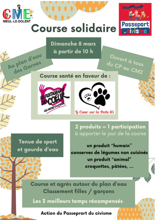 Dans le cadre du Passeport du civisme, le Conseil Municipal des Enfants organise une course solidaire en faveur des Restos du Cœur et de l'association "Le cœur sur la Patte 85" dimanche 8 mars à partir de 10h au plan d'eau des Garnes.