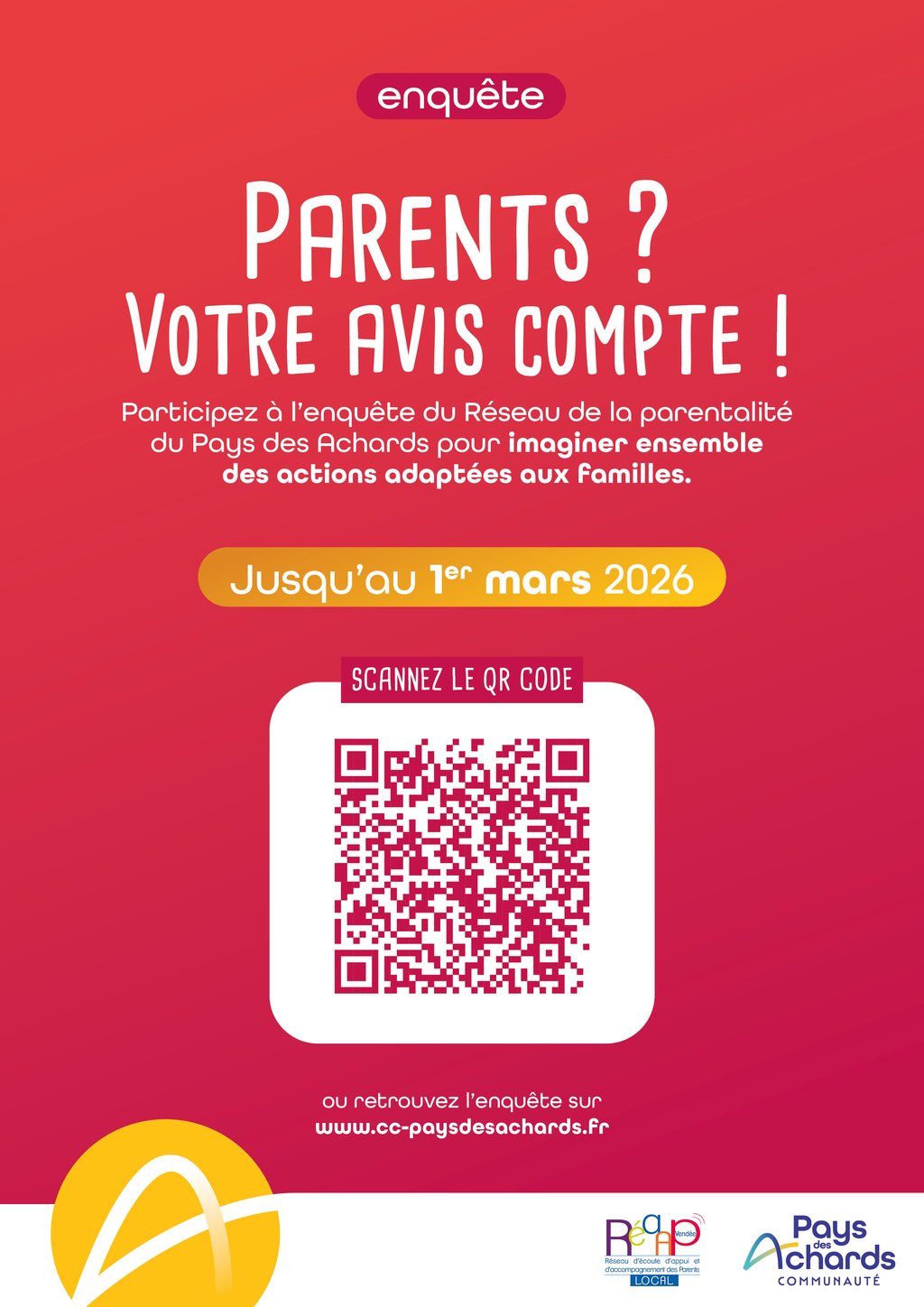 Le Réseau de la parentalité du Pays des Achards (REAAP) mène actuellement une enquête auprès des familles afin de mieux identifier leurs besoins et leurs attentes autour de la parentalité.