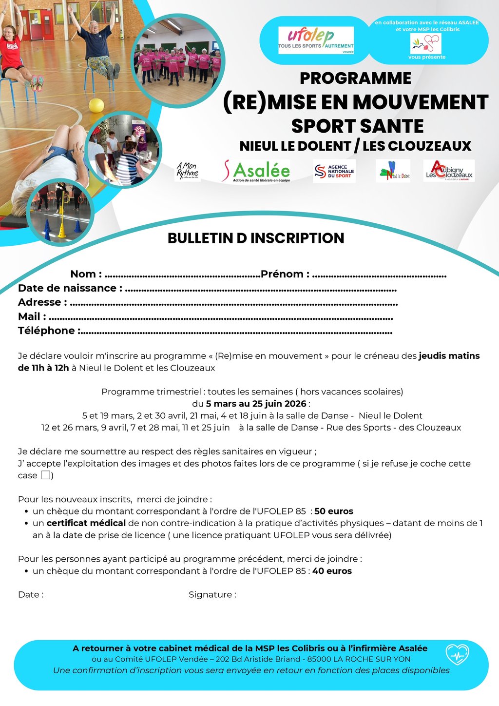 Informations et inscriptions auprès de votre cabinet médical ou infirmière Asalée, par mail à ufolep.85@gmail.com ou par téléphone au 07 71 06 57 24 (bulletin d'inscription téléchargeable ci-dessous)