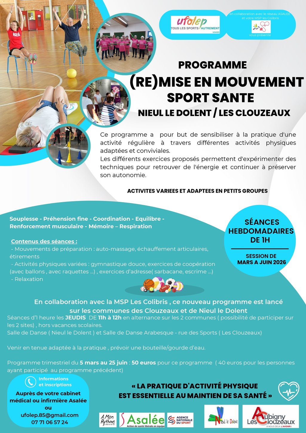 Le Comité Départemental UFOLEP de VENDEE en collaboration avec la MSP Les Colibris et le réseau ASALEE vous présente le programme « (Re)mise en mouvement » sport santé sur les communes des Clouzeaux et de Nieul-le-Dolent.