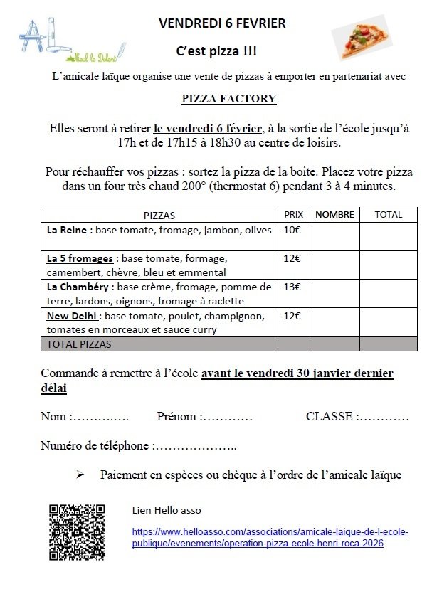 📲 Vous pouvez également commander directement via hello asso : https://www.helloasso.com/associations/amicale-laique-de-l-ecole-publique/evenements/operation-pizza-ecole-henri-roca-2026