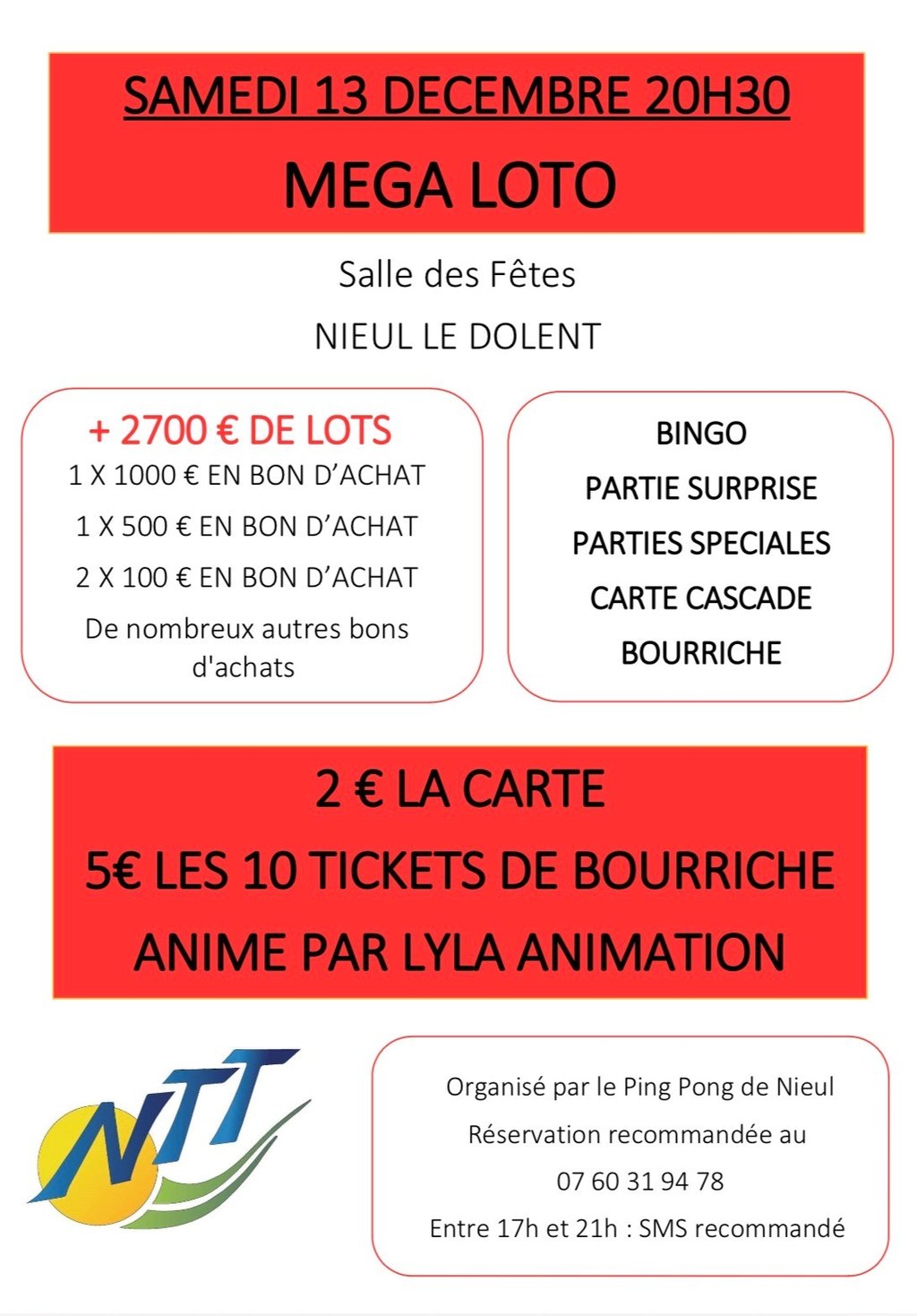 Le club NTT organise un méga loto animé par "Lyla animation" à la salle des Fêtes.