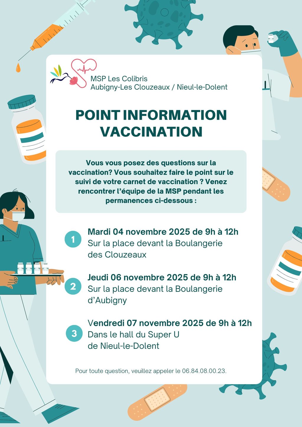 L'équipe de la MSP Les Colibris située sur Nieul-le-Dolent et Aubigny-Les Clouzeaux organise des temps de sensibilisation auprès des usagers des deux communes de la MSP (Aubigny-Les Clouzeaux et Nieul-le-Dolent).
